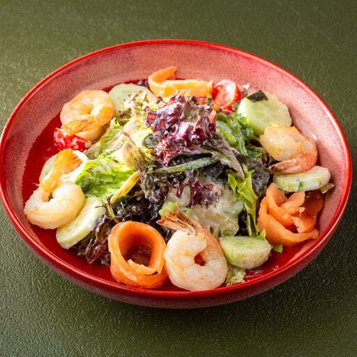 рукола, микс салата, семга слабосоленая, креветки, йогуртовая заправка, огурец, помидор черри, цветной перец запеченный