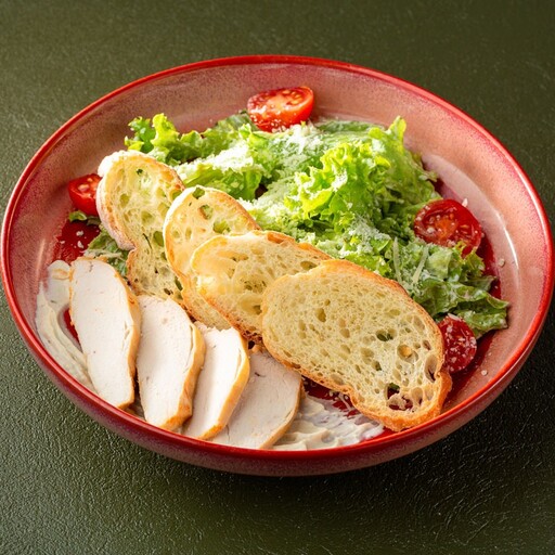 лист салата, соус цезарь, пармезан, помидоры черри, сухари, курица