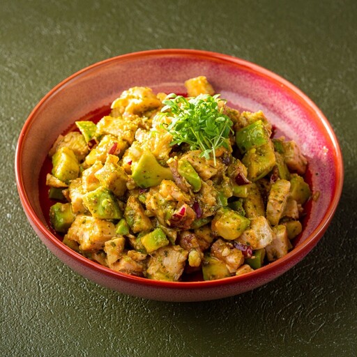 куриное филе, авокадо, микс зелени, соус песто, орехи грецкие, красный лук, соус кимчи