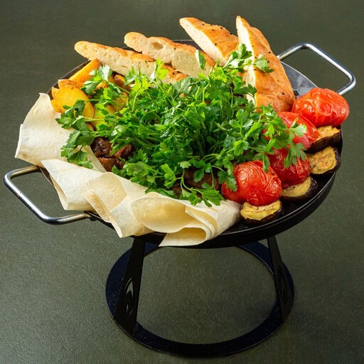 Баранина, грибы, лук репчатый, помидоры , баклажаны, лаваш, турецкий хлеб, зелень , картофель, кимчи