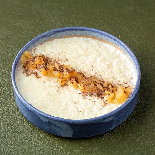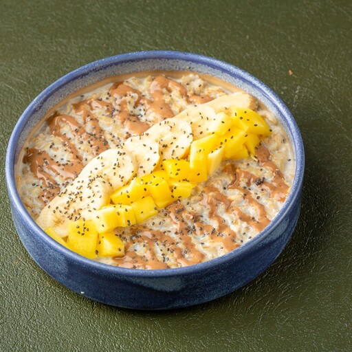 Воздушная овсяная каша, приготовленная на основе сливок с бананом, клубникой и миндальным урбечем