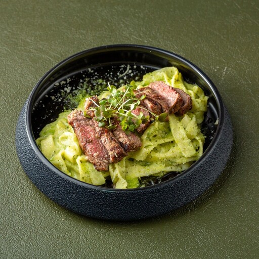 паста фетучини, телячья вырезка, сливочный соус, сыр пармезан, микрозелень, фирменное греческое масло
