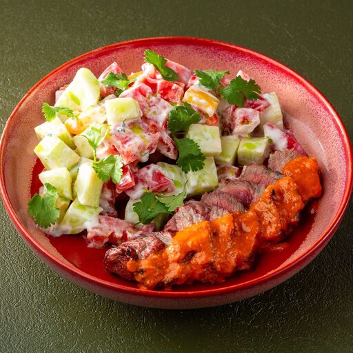 Вырезка телятины, томаты, огурцы, цветной перец, йогуртовый соус, кинза, микрозелень, зеленое масло