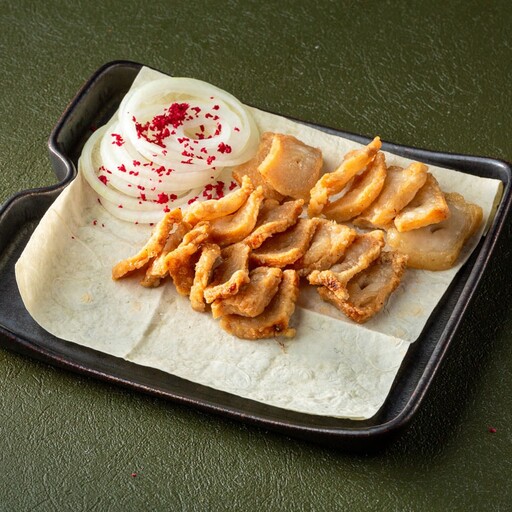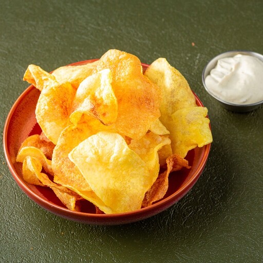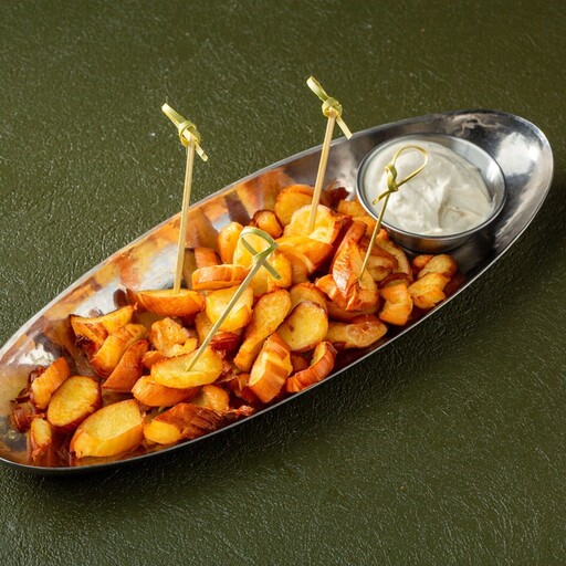 Жареный слоеный хинкал, вареное куриное яйцо, сушеная горская колбаса, сметана,молодой жареный картофель