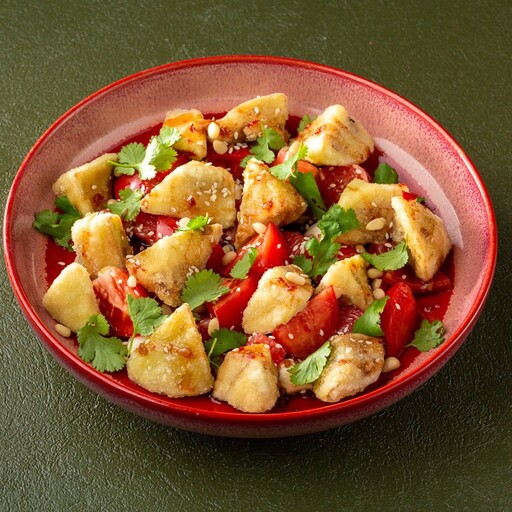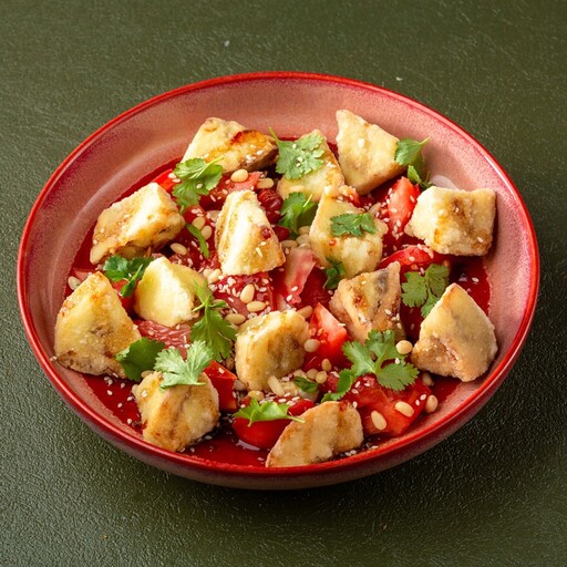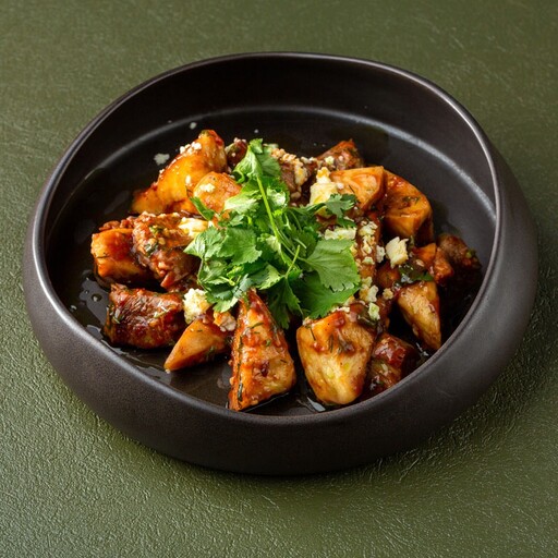 баклажан, томаты, грейпфрут, творожный сыр, соус сладкий чили, кедровые орешки, кунжут, кинза