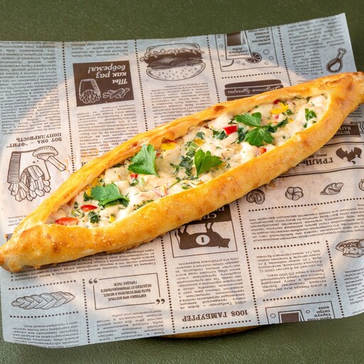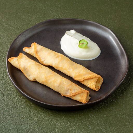 тонкий хинкал, грибы, соус альфредо, индейка отварная, чеснок, чили перец, зелень микс, микрозелень, грибной мусс, сыр дагестанский, фирменное греческое масло