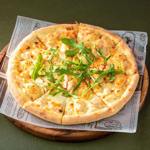 Тесто на пиццу, моцарелла, сливочный соус, семга, микрозелень