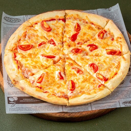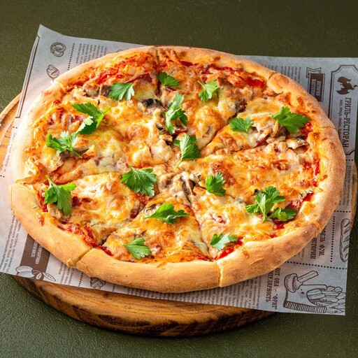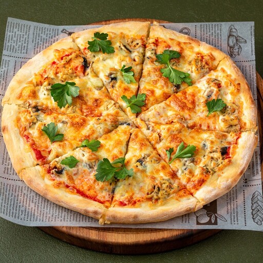 Тесто на пиццу, томатный соус, грибы, филе куриное, моцарелла, помидор