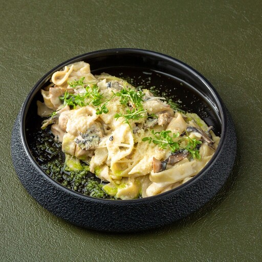 паста фетучини, куриное филе, сливочный соус, сыр пармезан, микрозелень, фирменное греческое масло