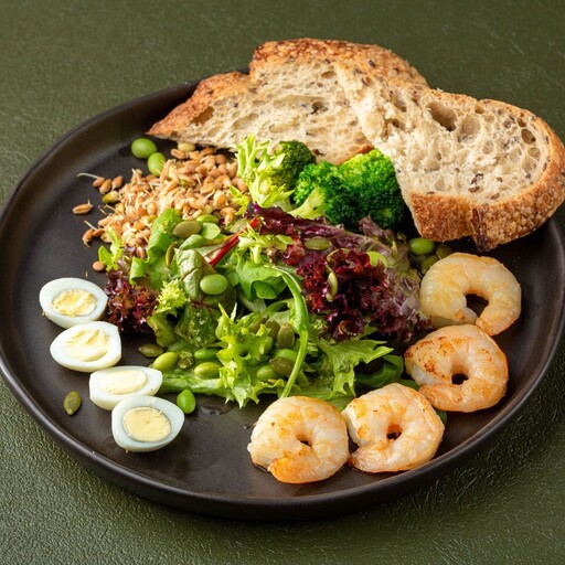 Перепелиные яйца, брокколи, креветки, микс салата, бобы эдамаме, семена льна, проростки пшеницы маш и зеленой гречки, греческий соус и цельнозерновой тост