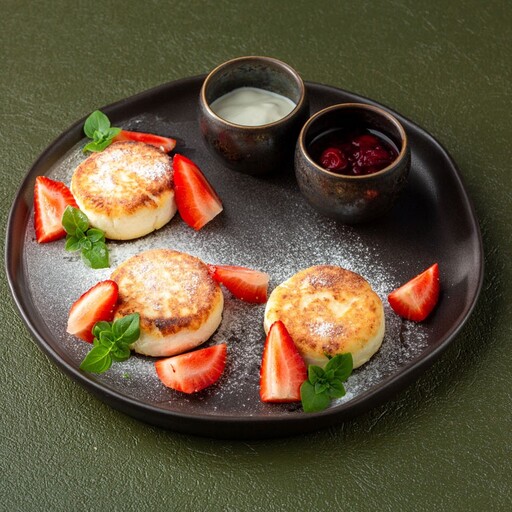 Легкие и нежные сырники, хрустящие снаружи и почти заварные внутри. Подаются с воздушной сметаной