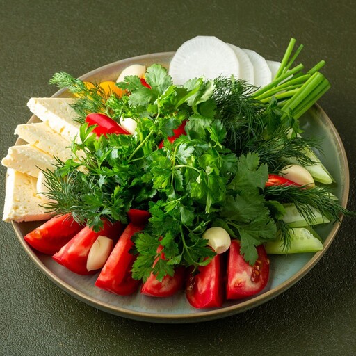 Помидор, огурец, зеленый лук, чили перец, редька, цветной перец, зелень микс, сыр Дагестанский