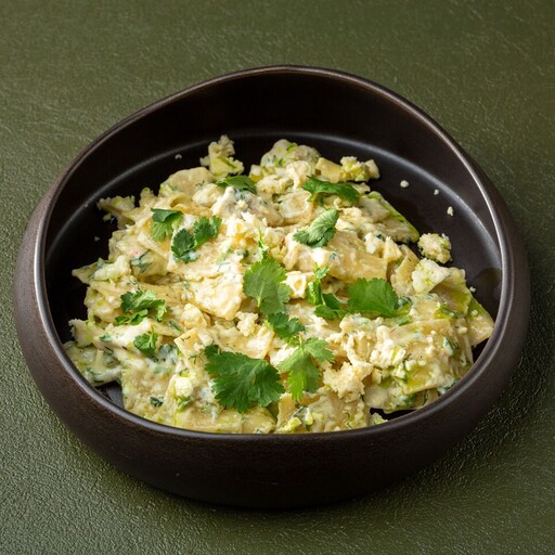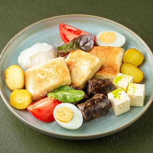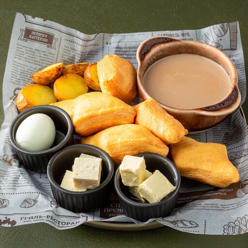 Традиционные лепешки, калмыцкий чай, сливочное масло, сыр дагестанский, яйцо вареное, жареный молодой картофель