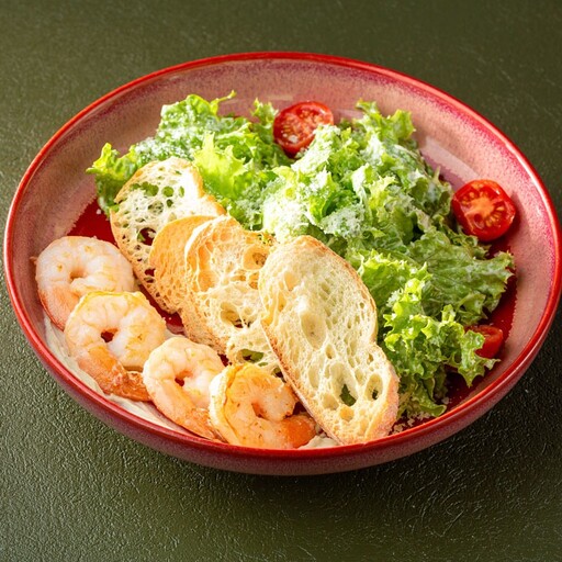 лист салата, соус цезарь, пармезан, помидоры черри, сухари, креветки