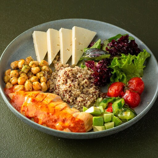 филе куриное, нут, авокадо, помидоры черри, огурец, киноа, микс салата, соус хариса, зеленое масло, соус песто, сыр дагестанский, соус альфредо