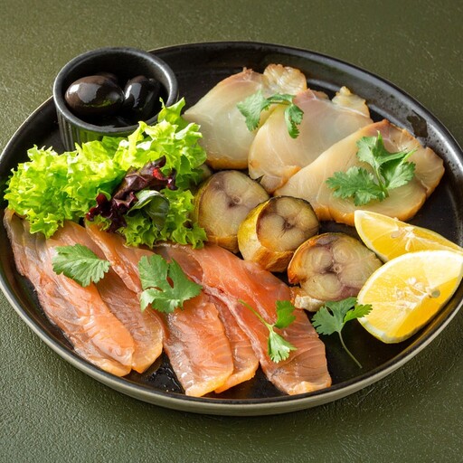Семга слабосоленая, масленая рыба, скумбрия копченая, капперсы, оливки, маслины, лимон