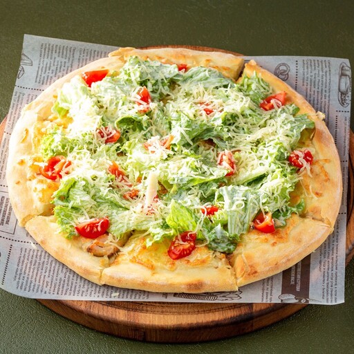 Тесто на пиццу, соус цезарь, сыр пармезан, сыр моцарелла, листья салата, куриное филе, помидоры черри