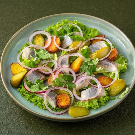 Филе сельди, картофель, огурцы карнишоны, лук, зелень микс , оливковое масло