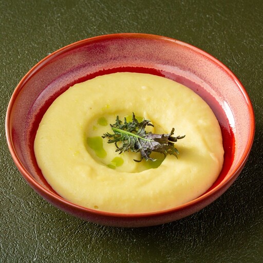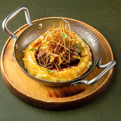 томленые говяжьи шечки ,картофельное пюре ,чипсы из лука парей,миндаль,микрозелень,зеленое масло