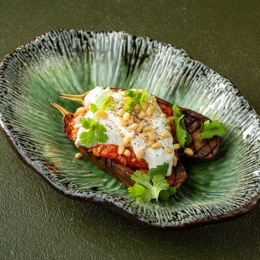 Баклажаны, сметана, чеснок, сушеная мята, микрозелень, кедровые орешки, кунжут, томатный соус