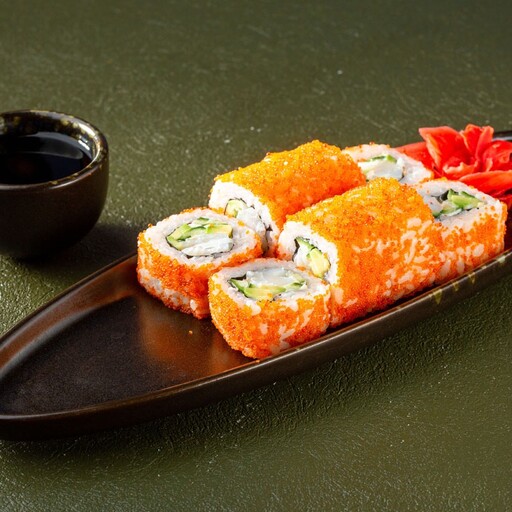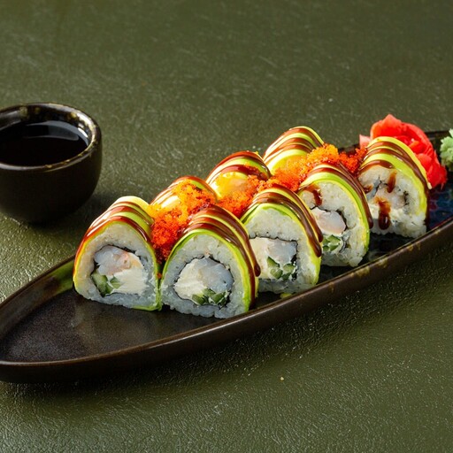 Авокадо, огурец, креветки в кляре, нори, рис, сыр творожный кремето, соус унаги