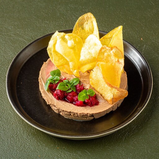 Куриная печень, морковь, лук, вишневый соус, чипсы