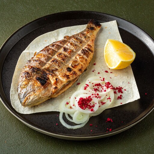 плотное и нежное мясо рыбы дорадо, приготовленное на открытом огне, лимон, репчатый лук