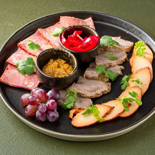 Ростбиф, мясо по-кавказски, куриное филе копченое, ветчина из индейки, зернистая горчица, виноград