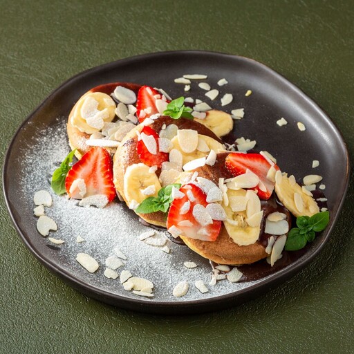 Воздушные и пышные панкейки с нежной бисквитной структурой и золотистой корочкой.Подаются с шоколадом и ягодами