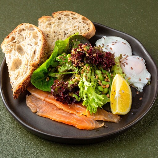 Семга слабосоленая, яйца пашот, микс салата, бобы эдамаме, семена льна, проростки пшеницы маш и зеленой гречки, греческий соус и цельнозерновой тост