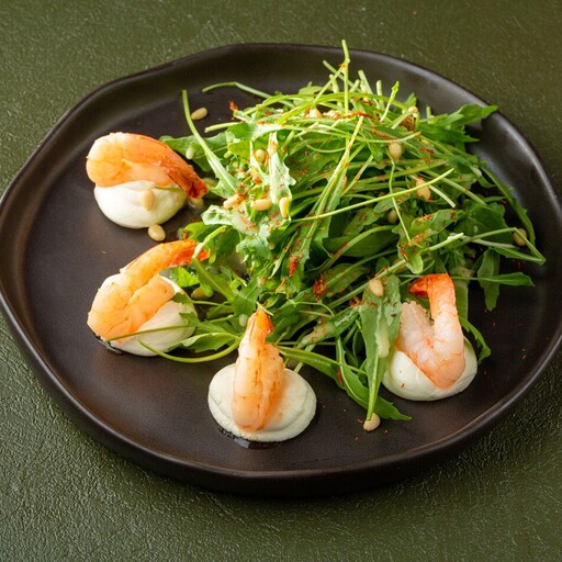 креветки, рукола, творожный сыр, авокадо, манго, греческий соус, кедровые орешки,шафран