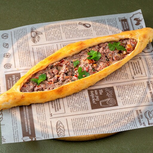 Тесто дрожжевое, телятина рубленая, зелень, лук, помидор, цветной перец, кинза