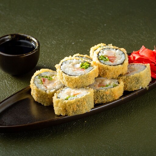 Нори, рис, сыр пармезан, соус цезарь, креветки, помидоры, лист салата, кляр, сухари