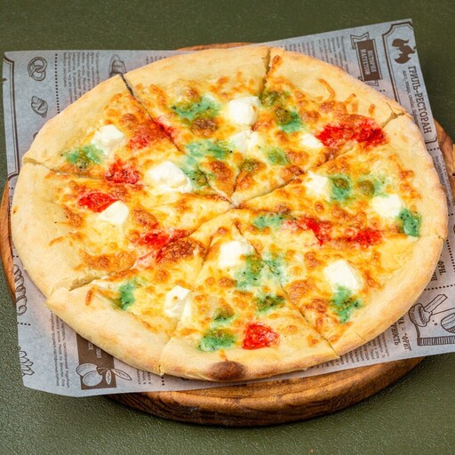 Тесто на пиццу, сыр моцарелла, сыр пармезан, сыр гауда, сыр фета, сливочный соус