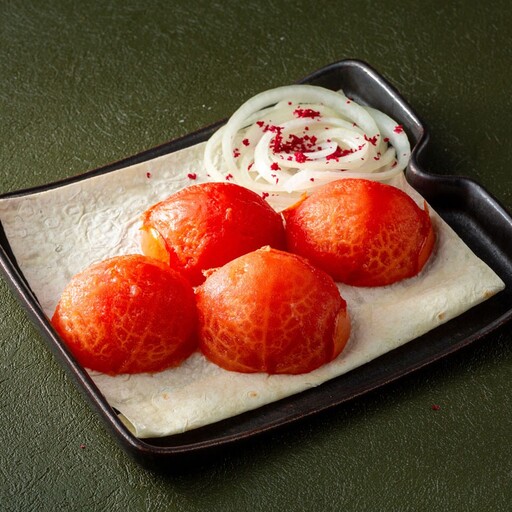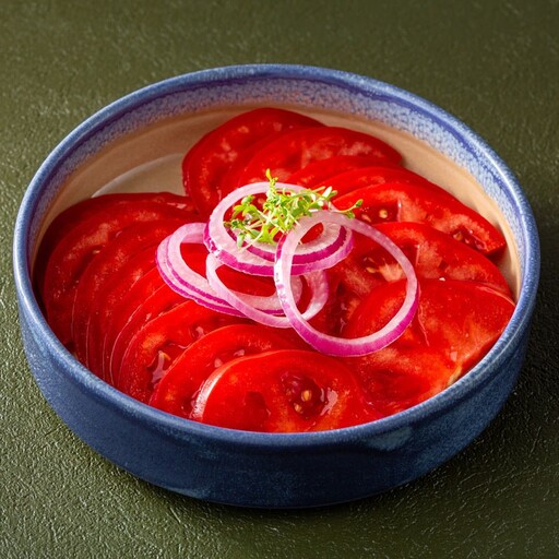 помидор, красный лук, оливковое масло, уксус, микрозелень