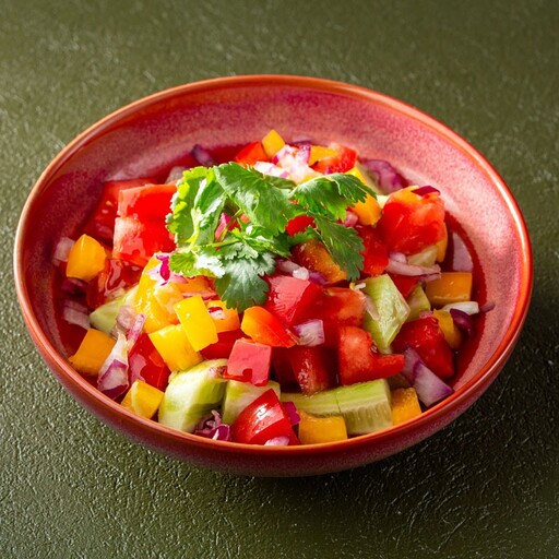 помидоры, огурцы, цветной перец, лук красный, микс зелени, заправка на выбор (сметана, масло, майонез)