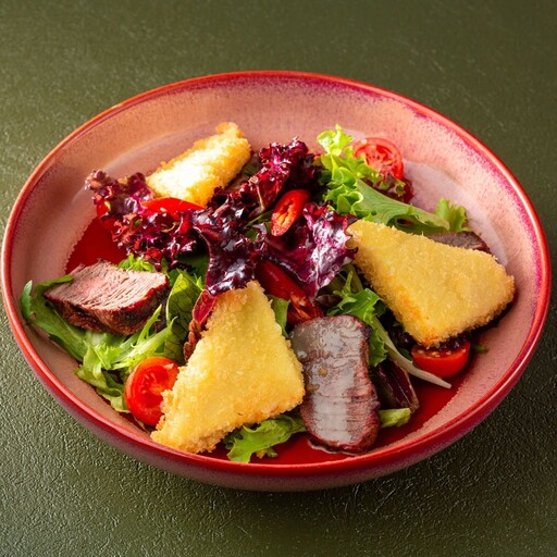 вырезка телячья, рукола, микс салата, манго, помидоры черри, сыр дагестанский в хрустящей панировке, чили перец