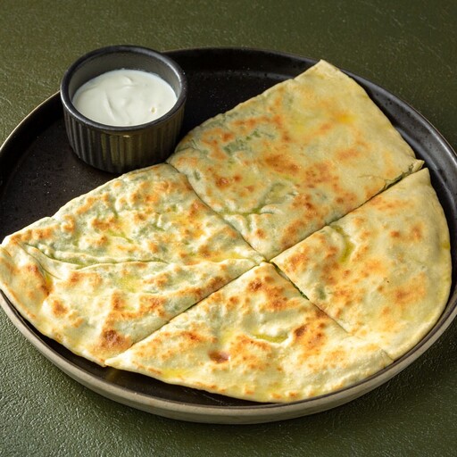 Тесто бездрожжевое, шпинат, зеленый лук, лук репчатый, сыр дагестанский, сливочное масло и мацони