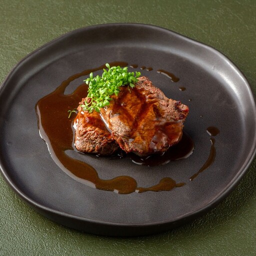 Телячья вырезка, пряные приправы, микрозелень, соус демиглас, кимчи