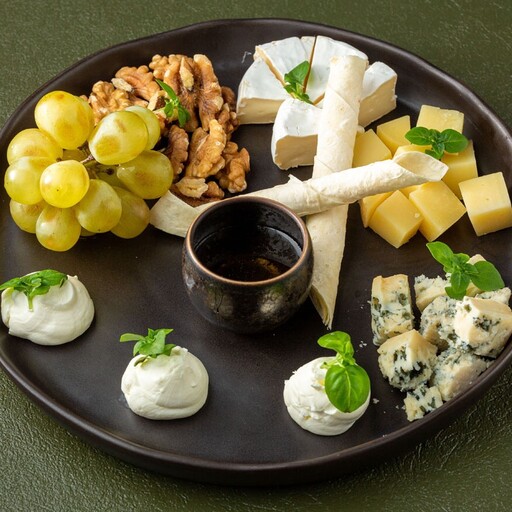 Крем сыр, дорблю, камамбер, пармезан, лаваш, мята, мед, ягоды, орехи