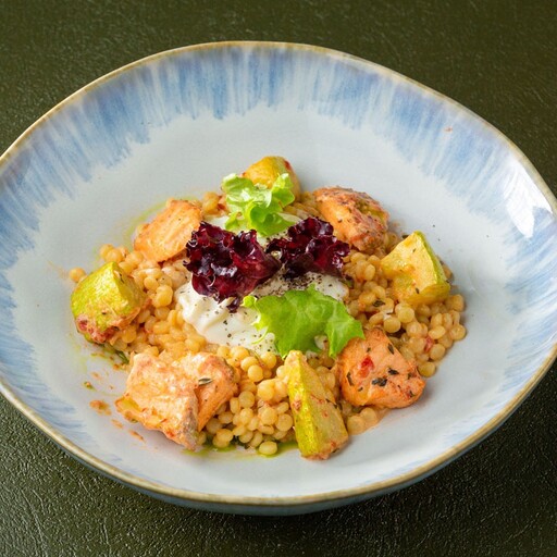 паста птитим, семга копченая, сливочный соус, сыр страчателла, шпинат, кабачок, итальянский томатный соус