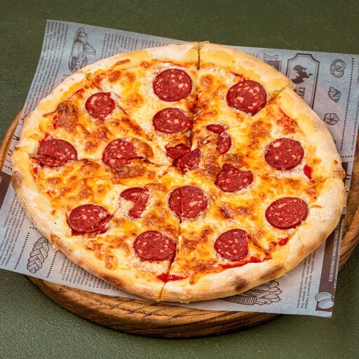 Тесто на пиццу, томатный соус, колбаса пепперони, сыр моцарелла