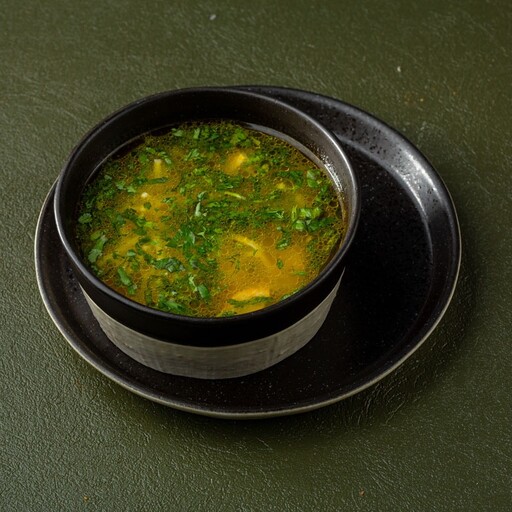 куриный наваристый бульон, курица, лапша домашняя, картофель, зелень